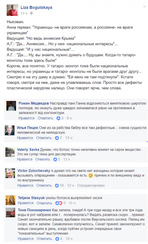 Заявления Анны Герман спровоцировали в украинском сегменте интернета мощнейший всплеск ярости и ненависти. Разумеется, в части той общественности, которая не менее яростно все эти годы противопоставляет свою цивилизованность и высокопородность "немытой русской орде". В отношении Анны Герман началась типичная в таких случаях травля, в ходе которой прирожденные европейцы не гнушались никакими словесными средствами и охотно демонстрировали, что никогда не устанут от поиска самого последнего днища морального падения. Впрочем, выхода у них нет: основной инстинкт подсказывает, что изменение политического ландшафта Украины для них чревато нарами только в самом удачливом случае.