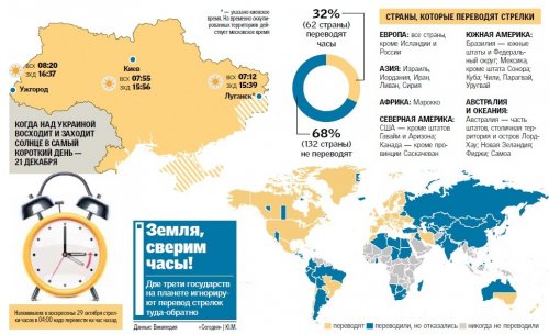 Наша страна живет по киевскому времени, которое соответствует 2-му часовому поясу (+2 часа от времени по Гринвичу, принятого за точку отсчета). Хотя географически 5% территории из этого пояса "выпадают": часть Закарпатской области попадает в 1-й часовой пояс, а Луганская и часть Харьковской и Донецкой — в 3-й. Поэтому, по словам Бушуева, когда в Киеве 12:00, то в Луганске "по солнцу" должно быть 12:40, а в Ужгороде — только 11:35. Из-за этого в восточных областях люди недовольны летним временем, так как там светает в 3 часа ночи, а в западных — зимним, из-за которого в 9 утра все еще темно.