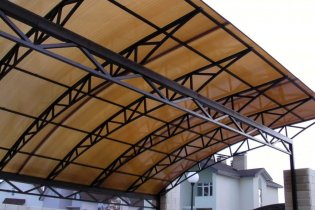 . Такая конструкция может заменить гараж, которых, к примеру в силу разных причин построить не получается. Такой навес для машины обеспечит надежное хранения автотранспорта, защищая его от воздействия любых проявлений погодных условий. Имея небольшую придомовую территорию можно построить не только навес под машину, но и козырек над входом, беседку для отдыха или теплицу.Поликарбонат имеет небольшой вес, обладает гибкостью, что позволяет создавать изящные и красивые композиции, которые в свою очередь могут украсить не только входную дверь, но и благоустроить большую часть двора.
