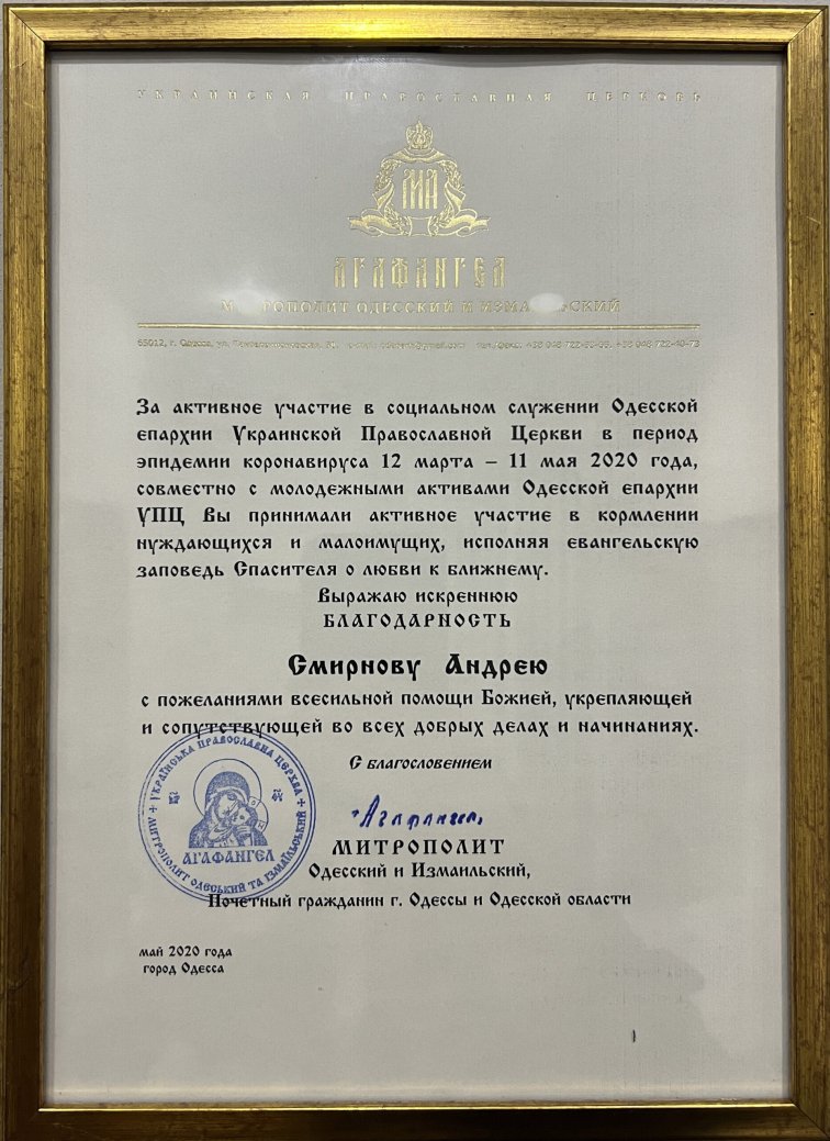 Молодий Одеський адвокат Смирнов Андрій Ігорович - засновник АО «Правовий елемент» в другий раз був нагороджений грамотой Агафангелом, митрополитом Одеським та Ізмаїльським за старанну працю на славу Святої Православної Церкви.