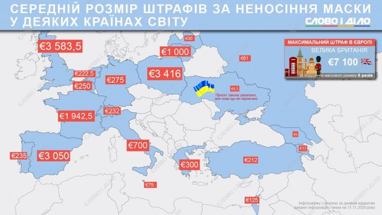 За неношение маски в общественном здании или транспорте в Украине могут оштрафовать на месте на 170-255 гривен (средний штраф - чуть больше 6 евро). В Европе суммы штрафов значительно выше, как и дисциплина.
