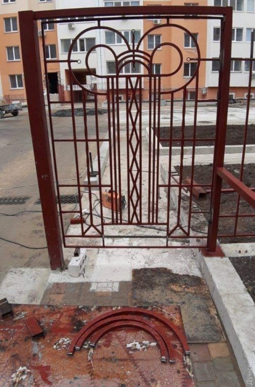 После критики в соцсетях диковинный кованый узор подрезали, а саму решетку перевернули, чтобы у местных жителей не возникало нездоровых ассоциаций каждый раз, когда они выходят из дома или возвращаются обратно.