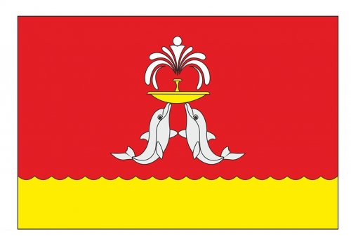 Флаг. Квадратное полотнище, на красном фоне два белых дельфина, поставленные друг против друга, держащие желтую чашу с которой фонтаном бьет белая вода. С нижнего края идет горизонтальная шиповидная желтая полоса (шириной в 1/3 стороны флага).