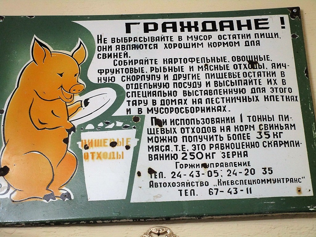 Ну а таблички, связанные с работой и бытом нашего человека в те времена — это, скажу вам, вообще прелесть! «Дом борется за звание «Дом коммунистического быта», «Трусить в парадных запрещается» (тут молодому поколению точно перевод требуется!), «Кабінет радянського будівництва», «Иностранные разведчики охотятся за любителями выпить»… А это не прелесть ли: «Здесь поднимают спущенные петли на чулочных изделиях» (да, да, была такая услуга! Пользовалась большим спросом) и «Требуйте полного налива пива». Имеется даже «Прейскурант на закупочные цены вторсырья от населения» тех времен. А насчет того, что запрещалось, или что, наоборот, делать было необходимо, то наш человек в те времена был просто постоянно окружен всеми этими указаниями-советами-приказами, начертанными на табличках-плакатах. Это сразу становится ясно, когда попадаешь в необыкновенный музей Александра. Многие такие табличные наставления сегодня вызывают хохот, другие звучат вполне актуально и по сей день, третьи таки поражают «глубиной мысли».Машина времени — в центре города