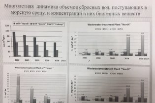 Если говорить о системах очистки сточных вод: СБО «Южная», СБО «Северная», системы порта «Южный» и порта «Черноморск», за исключением порта «Южный», это старые системы. Они используют устаревший во всем мире принцип очистки химического биоокисления Воротенко, в результате чего, очищая от одних веществ, они резко увеличивают концентрацию других. Например, избавляясь от органики, на выходе они сбрасывают разные формы азота, такие как нитраты и нитриты. Нитраты в воде, которую сбрасывают СБО после, так называемой очистки, в 6 -7 раз больше, чем на входе на очистку, а нитраты до 10 раз. Недавно мы проводили сравнение, брали образцы воды после очистки с СБО «Северная» и «Южная» и сравнивали со стандартными характеристиками очищенных вод с городов, где поставлены новые системы очистки. Это европейские города, арабские города, в которых этой проблеме уделяется внимание и выделяется финансирование. Показатели вы можете видеть на графике. Насколько у нас они завышены.![]()