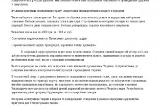 „Почему, скажите пожалуйста, люди тратят по 200-300… по 500 тыс. долларов для того, чтобы занять место мэра с зарплатой в 1000 долларов в месяц? …Каденция 5 лет, в году 12 месяцев, 5 лет это 60 месяцев, 60 месяцев – это 60 тысяч. Скажите пожалуйста: зачем вложить 500 тысяч в предвыборную компанию… чтобы получить обратно 60? Какой мотив?“„Когда висят эти борды, которые сейчас в предвыборную программу: они все выкуплены олигархическими группами на проданную землю и раскраденный бюджет, простой любой кандидат ни один свободный борд сейчас не найдет…“„Наша команда не будет участвовать в жестокой борьбе, мы будем говорить только о том, что мы собираемся делать, мы отказываемся от носителей, таких которые можно профинансировать только будучи коррупционером, наши канали – это facebook, Интернет. Никаких агитаторов у нас уличных не будет, может еще будут газеты, потому что действительно округ не маленький – почти 180 тысяч, хотелось бы донести свое мнение в каждый уголок, посмотрим, как у нас получится“.