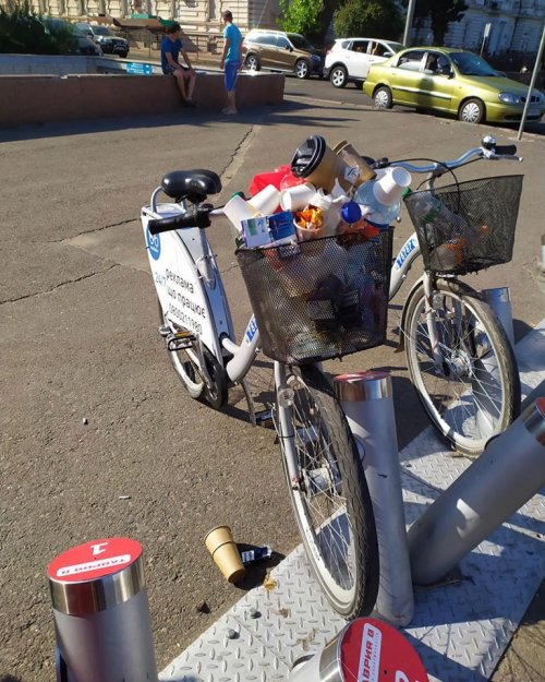 На снимках корзины велосипедов заполнены разным мусором — стаканчиками из-под кофе, пластиковыми бутылками, алюминиевыми банками и другими выброшенными вещами.