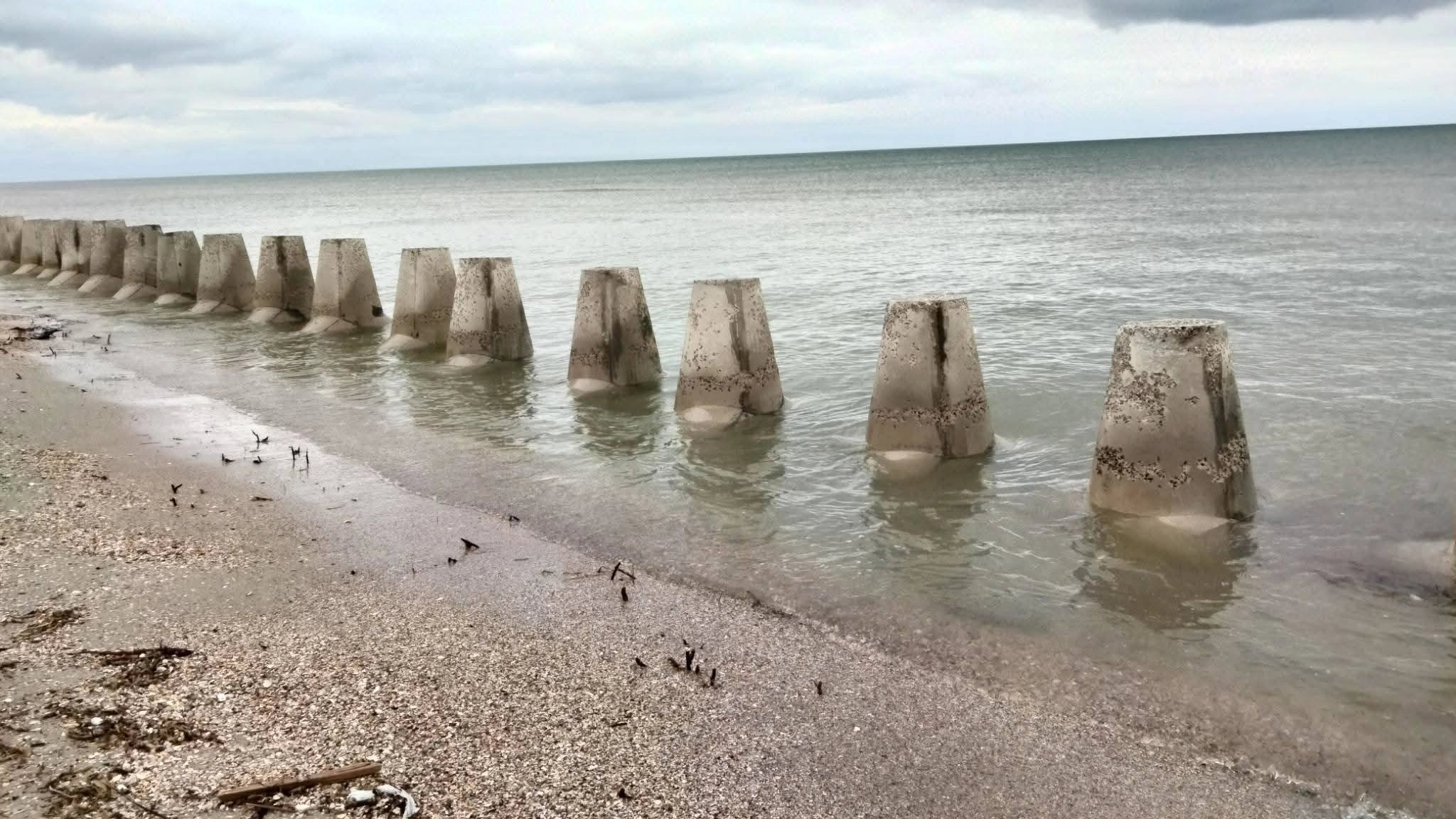 В Национальном природном парке «Тузловские лиманы» штормовое море вновь разрушает тетраподы, установленные на песчаной пересыпи в качестве защитных сооружений.