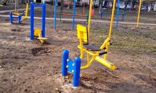 Также была установлена группа тренажеров просто в грязь. При этом некоторые из них незакреплены. Напротив тренажеров находится старая детская площадка, где также все находится в грязи, хотя благоустройство предусматривает нормальное покрытие.