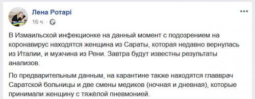 В тоже время на своей странице в Фейсбук Елена Ротари сообщает о том, что в Измаильской инфекционке на данный момент с подозрением на коронавирус находятся женщина из Сараты, которая недавно вернулась из Италии, и мужчина из Рени.