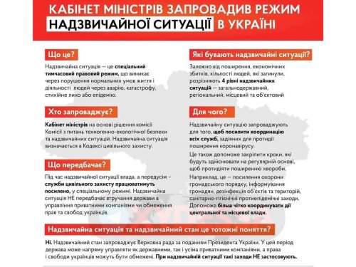 Правительство ввело режим чрезвычайной ситуации в Украине на 30 дней – до 24 апреля 2020 года. Такое решение принято сегодня на заседании Кабинета министров Украины. Премьер-министр Денис Шмыгаль отметил, что режим чрезвычайной ситуации не ограничивает конституционные права граждан, а только объединяет усилия вех регионов страны для преодоления угрозы: