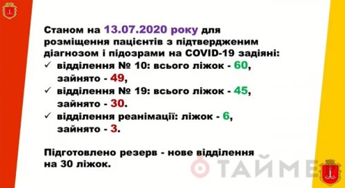 82 больных COVID-19 находятся в одесской городской инфекционной больнице по состоянию на утро 13 июля: 12 пациентов в тяжёлом состоянии и 70 — в среднем.