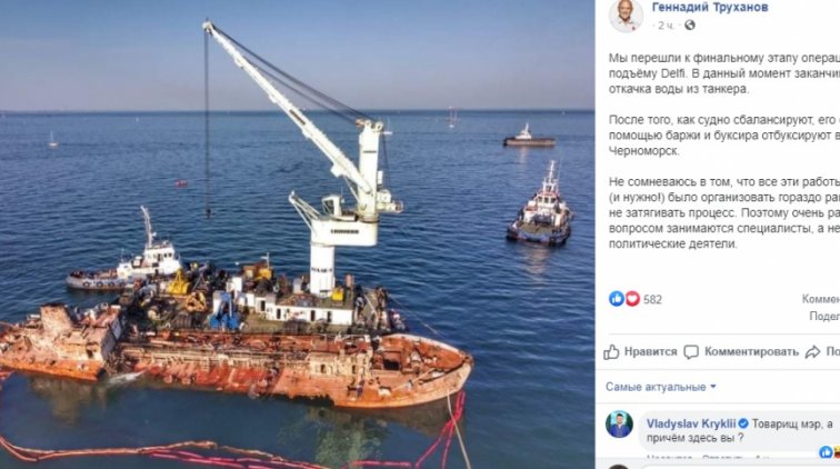 Мэр города Геннадий Труханов также сообщил в своем Facebook о финальном этапе поднятия танкера. Видеообращение он опубликовал вечером 6 сентября.
