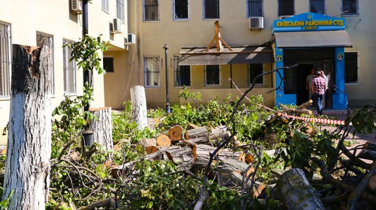 На территории внутреннего двора Киевского райсуда, который находится на Варненской 3Б, уничтожили пять здоровых взрослых орехов диаметром около 47 см. Сделала это частная фирма по заказу представителей суда.