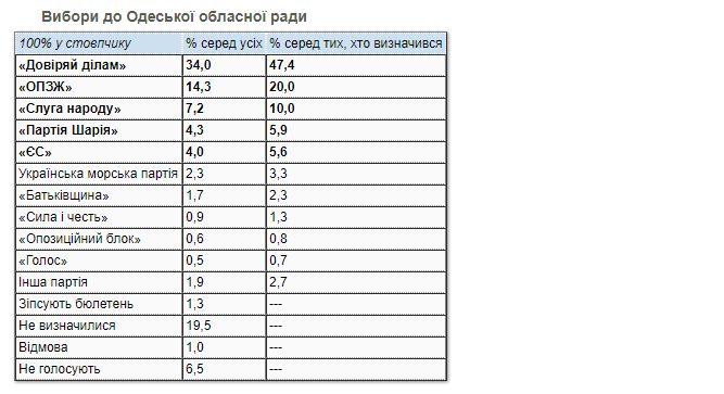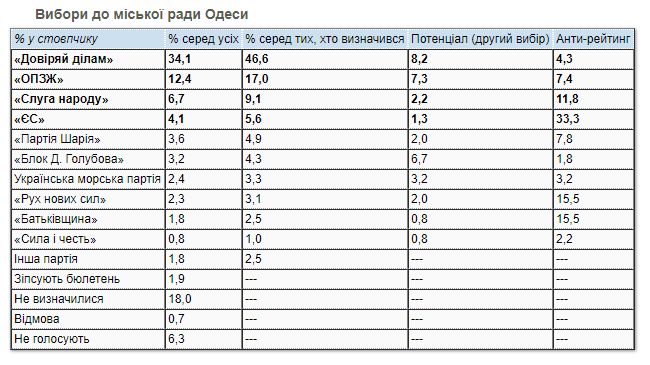 В рейтинге партий как на выборах в городской совет Одессы, так и на выборах в Одесский областной совет, наилучшие позиции имеет партия Труханова «Доверяй делам» (46,6% в городе и 47,4% в области).