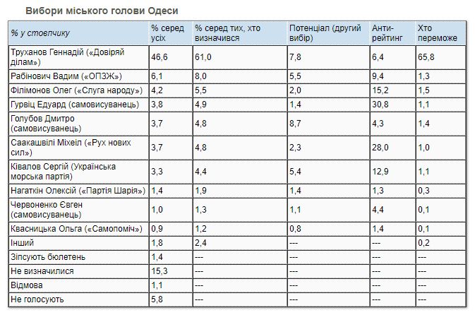К Труханову и лучше всего отношение из возможных кандидатов (к нему позитивно относятся 61,3% жителей Одессы, негативно – 15,6%). Далее по этому показателю идут Голубов (33,2% против 14,3%), Скорик (30,7% против 18,1%) и Рабинович (32,5% против 23,7%).