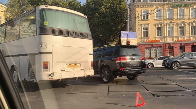 Дорогу на трамвайных путях не поделили автобус и BMW.