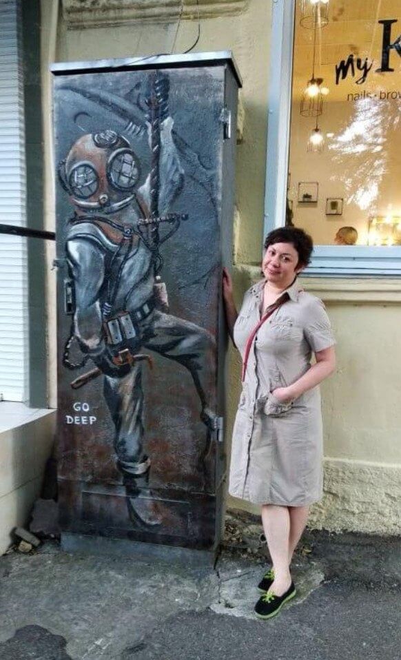 «Называется "погружение". Идея этого щитка родилась из моего увлечения такими направлениями как стимпанк, дизельпанк. А учитывая, что Одесса город приморский, с великолепными морскими традициями, город, гордящийся своей историей, я решила, что водолаз в костюме конца ІХХ будет отлично вписываться в местный ландшафт. Также делала серию щитков с мульт героями из " остров сокровищ" 1.5 года назад, до сих пор держатся, объявлениями не заклеили»,