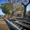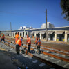 По состоянию на 12 октября на уже готовом отрезке новых трамвайных путей между выездом из трамвайного депо и Екатерининской идет уплотнение и подбивка щебеночного основания.