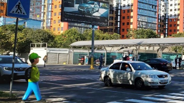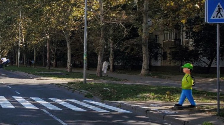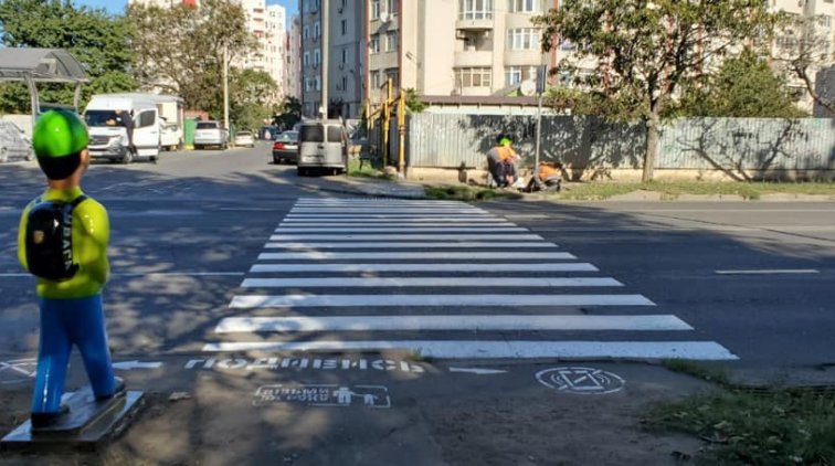 Возле пешеходного перехода на улице Малиновского установили манекен школьника, переходящего дорогу.