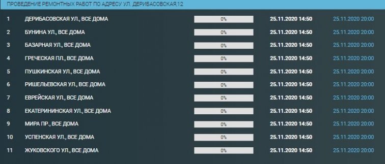 Ремонтные работы по улице 8 Марта, 105, продлили до 23:55, на Кривой Балке до 17:00, на Балковской 90/92 до 18:00, на Махачкалинской, 5а, до 16:00, на Капитана Кузнецова, 114, до 17:00, на Дерибасовской до 19:00.
