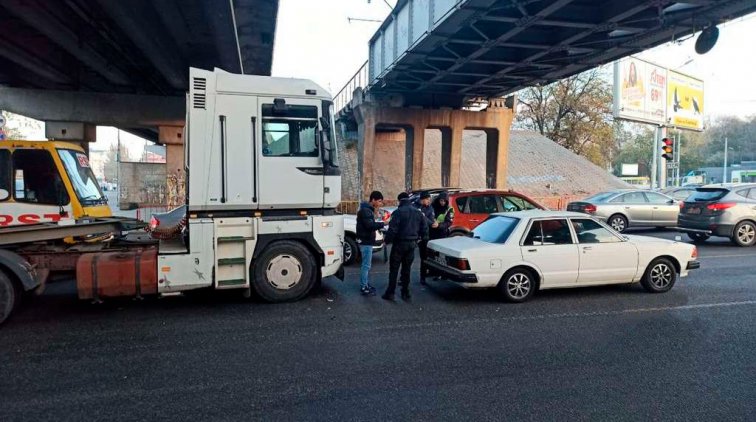 Фура с прицепом столкнулась с ехавшим впереди Nissan. В ДТП люди не пострадали. Однако возникла «тянучка» в сторону центра города. На месте уже работает полиция.