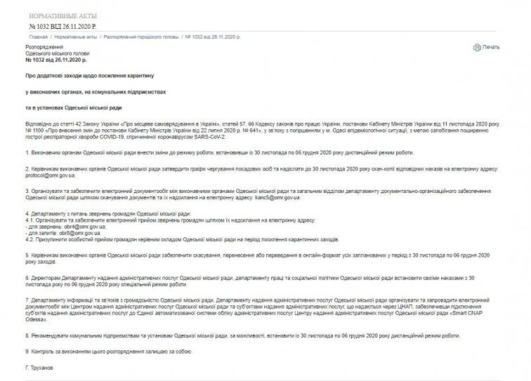 С понедельника, 30 ноября, исполнительные органы одесской мэрии переходят на дистанционную работу. Пока что — на неделю. Соответствующее распоряжение 26 ноября принял городской голова Геннадий Труханов.
