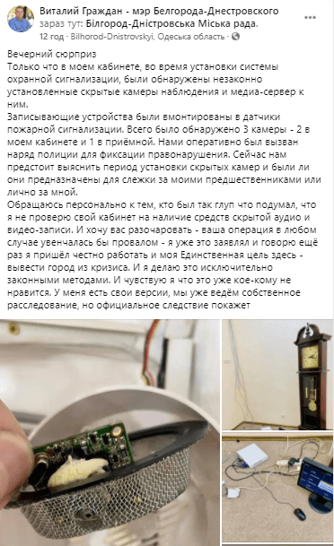 Вчера вечером, 7 декабря, в Белгород-Днестровском разразился громкий скандал. Мэр города Виталий Граждан (победил на минувших выборах от партии "Оппозиционная платформа - За жизнь" - Ред.) обнаружил в своем кабинете прослушку и скрытые камеры наблюдения.
