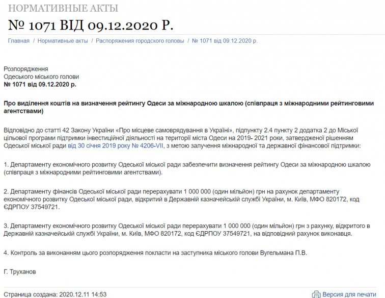 Согласно документу, определить рейтинг Одессы должны международные рейтинговые агентства, а деньги переведут на счет исполнителя. Контролировать процесс поручили вице-мэру Павлу Вугельману.