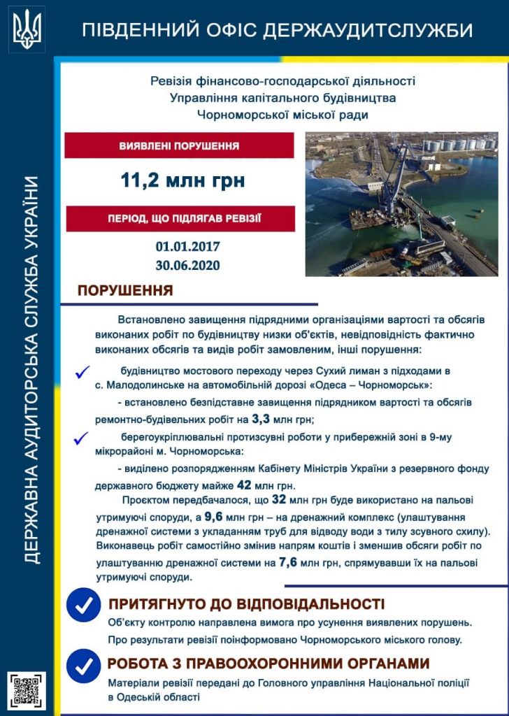 Во время проверки мостового перехода через Сухой лиман с подходами в селе Малодолинское на трассе Одесса – Черноморск выяснилось, что подрядчик необоснованно завысил стоимость и объемы работ на 3,3 млн грн.