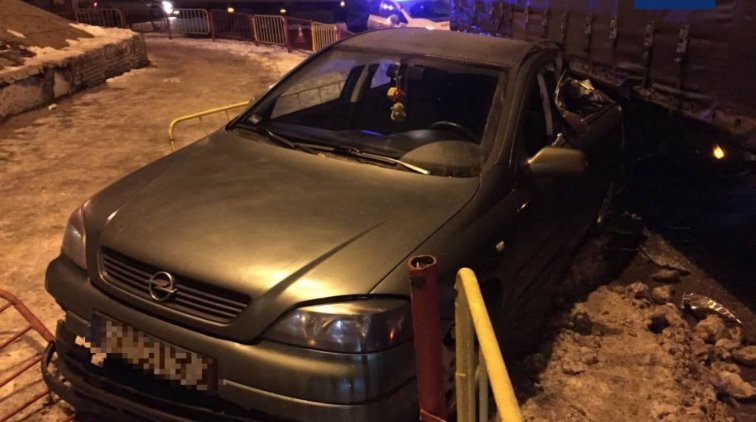 От удара «Опель» сбил ограждение и частично выехал на тротуар, а его задняя часть оказалась подмята грузовиком.
