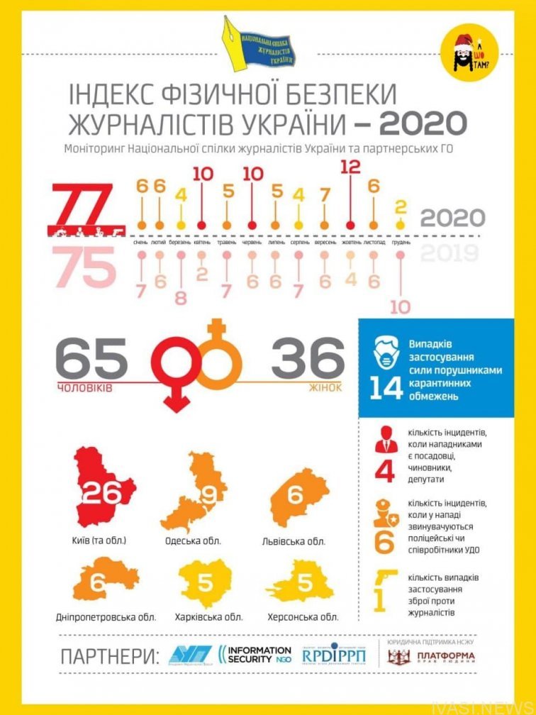 Национальный союз журналистов Украины опубликовал статистику за 2020 год в рамках исследования «Индекса физической безопасности журналистов».