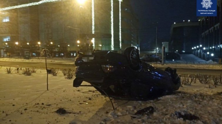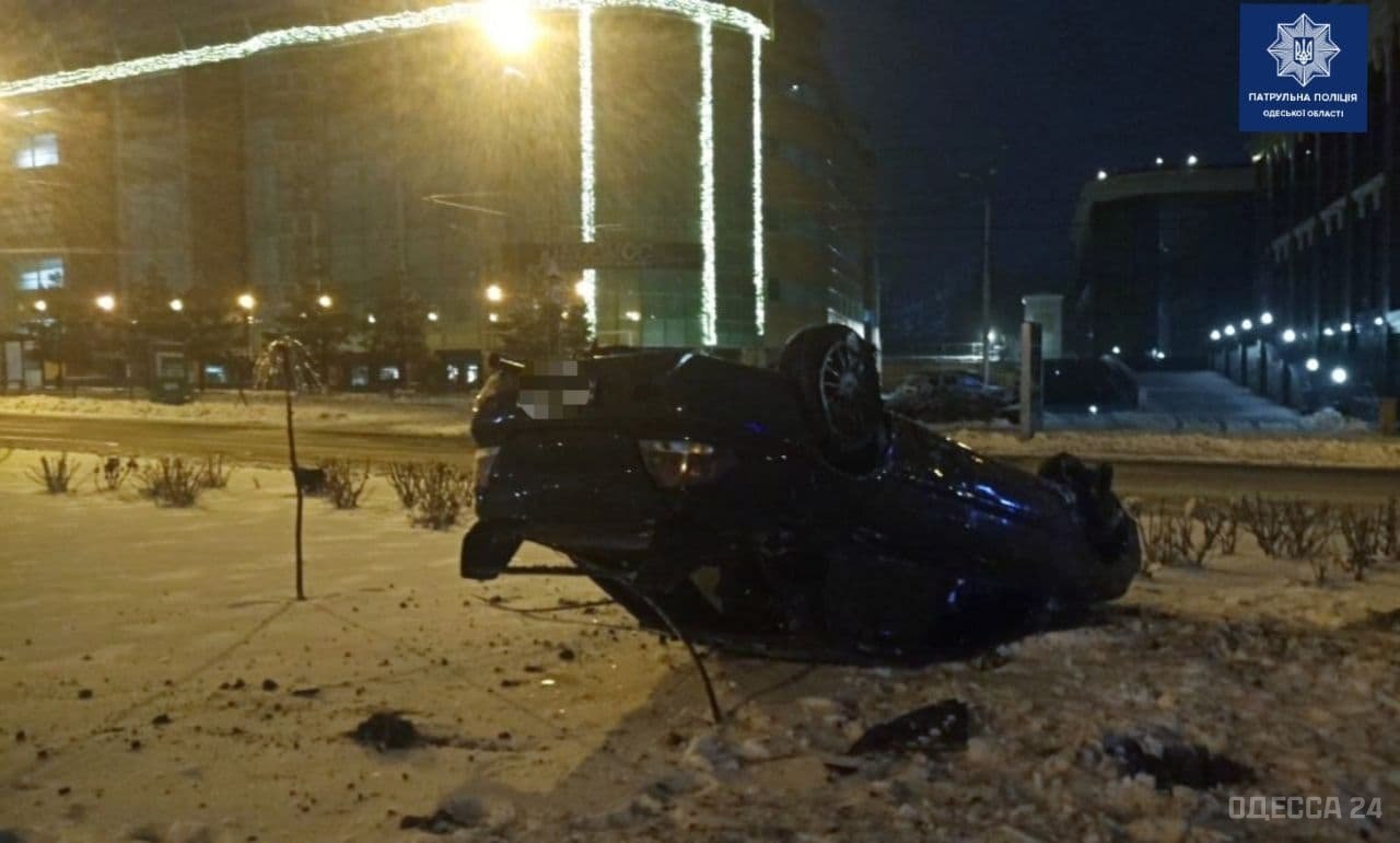В ночь на четверг на Генуэзской в районе площади 10 апреля водитель Mitsubishi не справился с управлением. Машина выехала на газон и перевернулась.