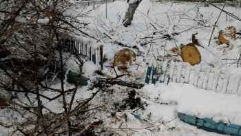 Упавшее дерево полностью разрушило заборчик. А ветки оборвали провода, до сих пор находящиеся под напряжением. А если кто-то на них наступит?