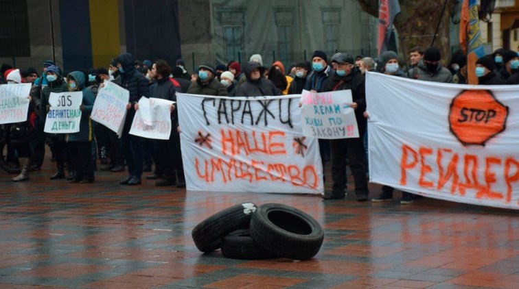 Участники акции принесли с собой плакаты и шины. Протестующие требуют не демонтировать их гаражи и позволить им зарегистрировать право собственности на них.