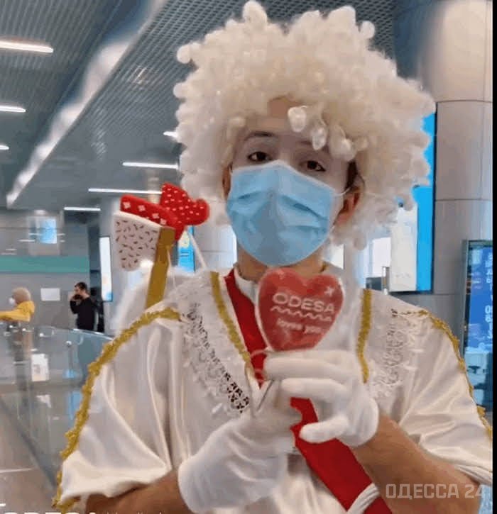 Сегодня в честь Дня Святого Валентина в аэропорту Одессы гостей встречал Купидон. В руках он нес белую корзину с алыми пряниками на палочке.