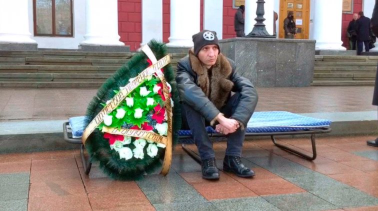 С одиночным пикетом на Думскую пришел одессит Денис Малахов, вооружившийся матрасом и похоронным венком. Таким необычным образом он хочет привлечь внимание к ситуации с гостиницей «Брик» в переулке Маяковского, которая мешает местным жителям спать громкой музыкой.
