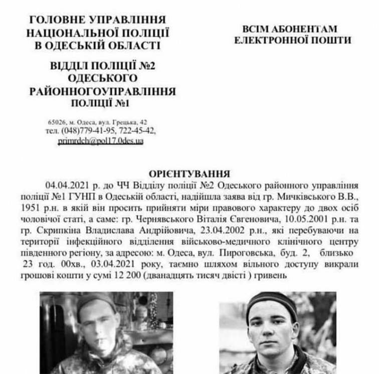 Полиция Одесской области разыскивает двух матросов, которые обокрали инфекционное отделение военного госпиталя по улице Пироговской в Одессе. Речь идет о Виталии Чернявском (19 лет) и Владиславе Скрипкине (18 лет), которые лечились от коронавируса.