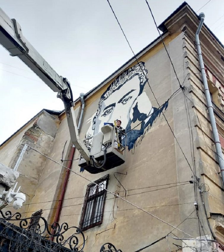 На Базарной, 33 одесская художница и певица Леся Верба рисует мурал, на котором будет изображён портрет писателя, журналиста и идеолога сионизма, одессита Владимира (Зеева) Жаботинского.