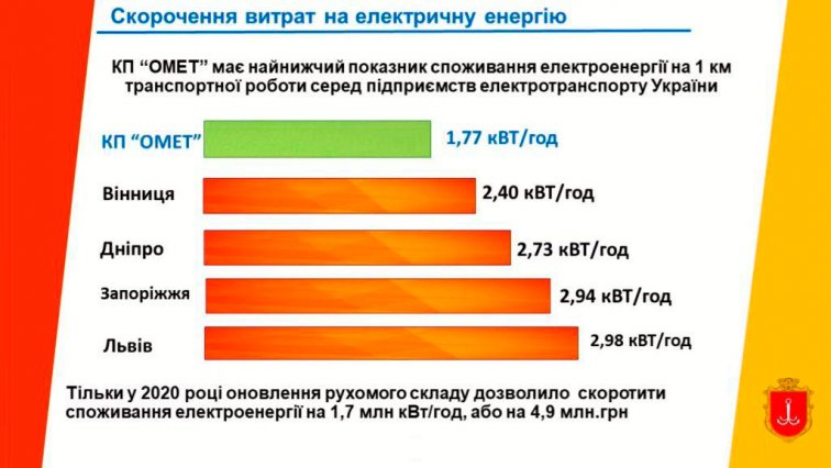 В частности, одесские трамваи и троллейбусы на один километр пробега расходуют 1,77 киловатт/час электроэнергии. В Виннице этот показатель составляет 2,4 киловатт/час на 1 км, в Днепре — 2,73 киловатт/час на 1 км, в Запорожье 2,94 киловатт/час на 1 км, во Львове — 2,98 киловатт/час на 1 км.
