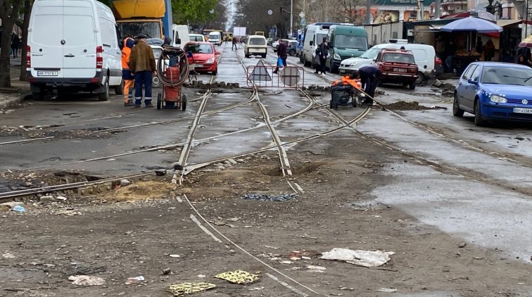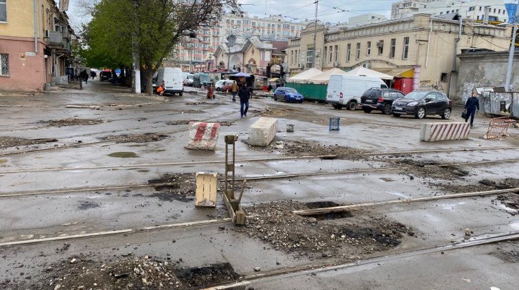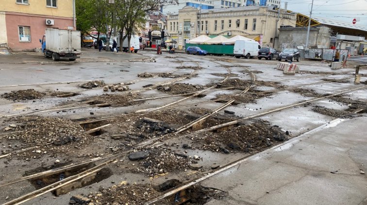 На сегодняшний день проводится демонтаж старых трамвайных рельсов со стороны улицы Новощепной ряд, после чего будут демонтированы старые бетонные плиты в межрельсовом пространстве и асфальтобетонное покрытие проезжей части, что позволит приступить к ремонту инженерных коммуникаций.