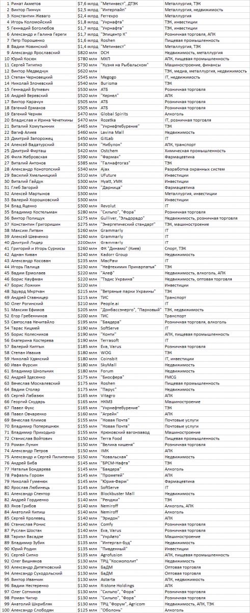 Замыкает рейтинг Юрий Родин на 90 месте со 135 млн долларов. Родин владеет частью банка «Пивденный», где является председателем совета акционеров, ему также принадлежит часть компании «Стальканат-Силур».