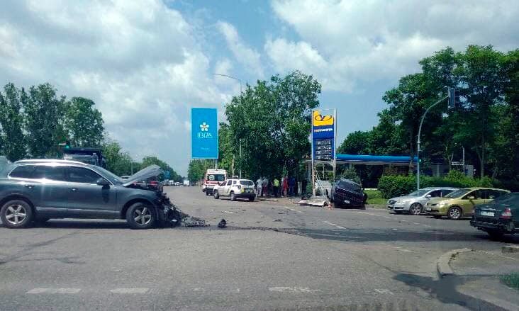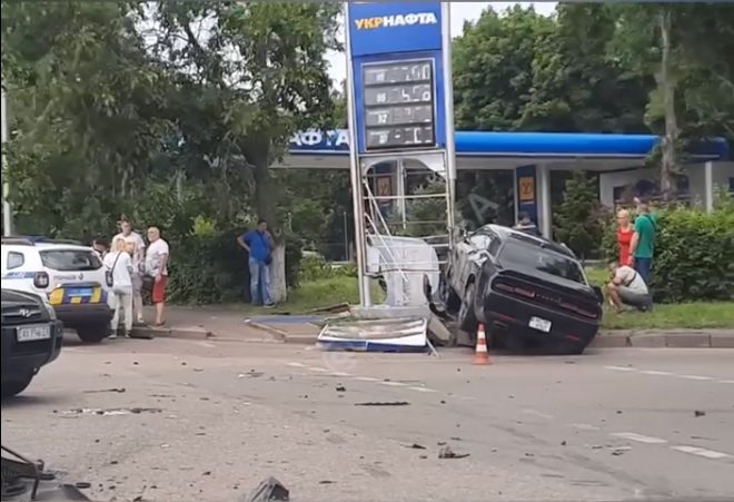 Возле одесского аэропорта автомобиль Volkswagen не уступил дорогу Dodge Challenger и тот влетел в стенд с ценами заправки Укрнафта.