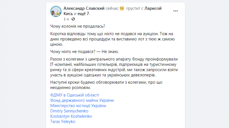 По его словам, информацию о продаже распространили среди ІТ-компаний, крупнейших отельеров, предпринимателей туристического рынка и сферы креативных индустрий, а также пригласили принять участие в аукционе одесских и украинских девелоперов. Тем не менее, имуществом никто не заинтересовался.