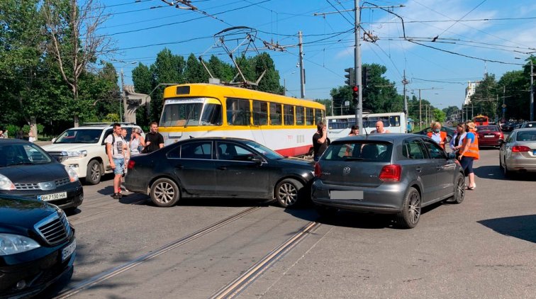 Утром авария парализовала движение на одном из самых оживленных перекрестков Одессы: на 5-й ст. Большого Фонтана столкнулись две легковушки – прямо на трамвайных рельсах.