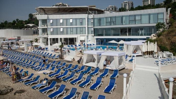 На видео, которое обнародовали очевидцы происшествия, видно, как пляж Аркадии охватил черный дым. Вокруг отеля собралось много людей, наблюдающих за пожаром.