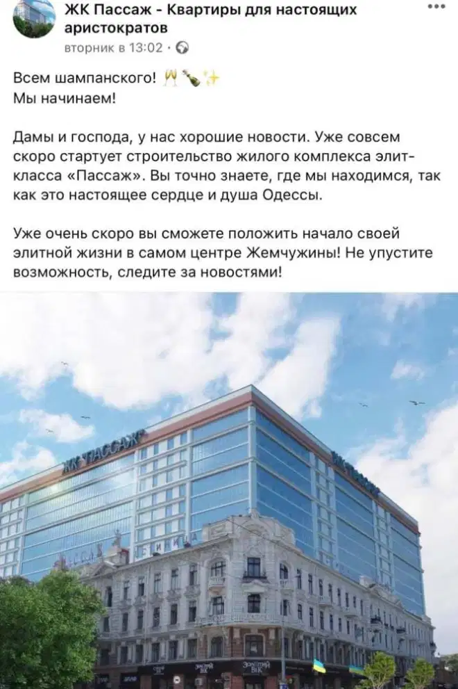 Кроме фото, руководство ЖК сумело подобрать и слова, чтобы успокоить одесситов: «Мы столкнулись с волной недопонимания и критики касательно нашего ЖК Пассаж! Поэтому хотим разъяснить ситуацию. Наша мотивация – сделать для города подарок и обновить легендарный Пассаж. Мы уважаем нашу историю и наше прошлое, но хотим идти вперёд и в ногу с будущим!