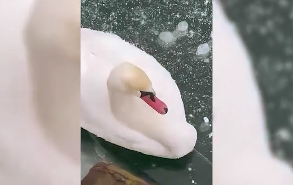На реке Турунчук пограничники спасли лебедя, примерзшего ко льду