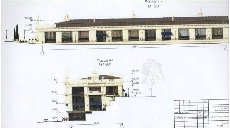 Геометрические размеры нового здания меняться не будут. А вот высота не должна превышать 18,6 метра, в угловой части - не более 21,3 метра - в соответствии с ограничениями высоты застройки в историческом центре Одессы. Таким образом, у владельца есть возможность достроить один или даже несколько этажей, о чем прям сказано в документации, дающей право достроить один этаж и мансарду. Но эскиз показывает "всего лишь" пять этажей - тогда как в старом здании было три этажа.