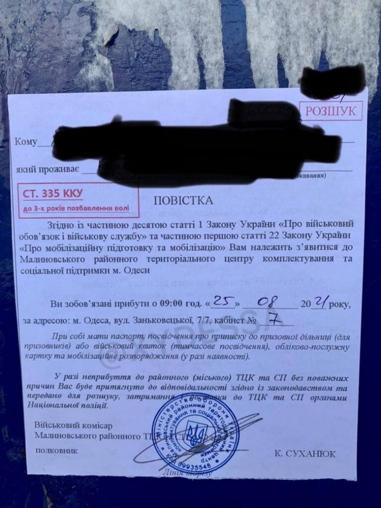 «Вот такой радостью наделяет военкомат с утра, клея на парадные двери !!! Особо радует РОЗЫСК и срок лишения СВОБОДЫ до 3-х лет. А искать даже никто и не пробовал …., даже в дверь не звонили», — говорится в пояснении к фотографии.